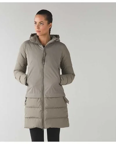 I love this 'soft earth' coloured 'Cold as Fluff' goose down parka by Lululemon. An attached hood for super windy days. I like a hood, but I know not everyone does. It's a great length...keeps the booty warm, but not too long for the car.