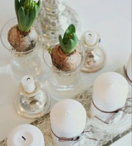 White, silver and green, so gorgeous. I sure hope when those hyacinths pop open they'll be white. I love this vignette because it doesn't scream Christmas.
