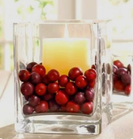 Cranberries in a square glass vase have to the dead easiest centerpiece to create. Line five of these simple arrangements down the centre of your table and your table for a fab, festive look.