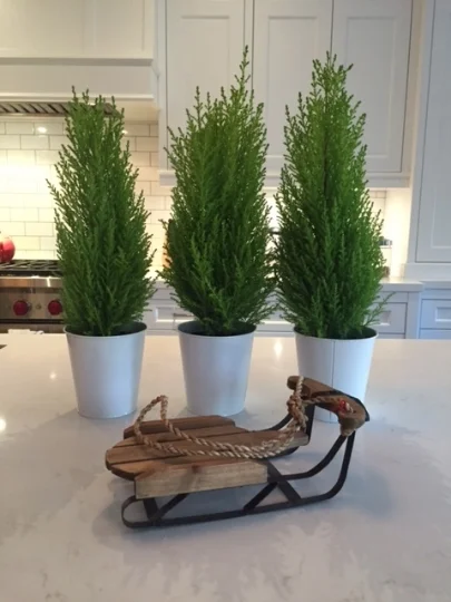 This little line up of acid green cyprus sits on my island. I love this because it's going to last right through the holidays and I don't have the expense of new flowers weekly. These were purchased at Longo's for $10 each…pots and all.
