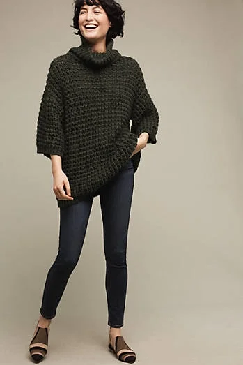 1. Since chunky knits tend to be big and billowy, it's great to style them with a sleek bottom. A skinny jean (there she goes with the skinnies again) and bootie or over-the-knee boot (I personally don't care for these - but they work) are perfect!