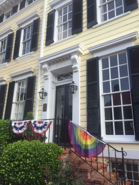 I love the historical blue homes. Flags fly everywhere in this neighbourhood.