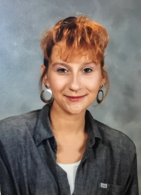 Oh Em Gee!!!! There is so much wrong with this photo on so many levels, I don't even know where to being. So let's just begin with the obvious...WTF ORANGE HAIR! Not just the colour, it's the teased and sprayed bangs. Those bangs did not move. What you can't see is the pony tail that's wrapped up in a piece of leather. Edgy...right? And those whisps I pulled out from the sides...fancy. Moving on to my pink and grey eye makeup, because it had to match my grey shirt with the shoulder pads that I used to slip under my bra to hold in place. I'm sure my sister pulled them out of one of her blazers for me. ;) And of course the big hoops in my ears - the bigger the earrings, the better. I will give myself one thing...nice clear skin! Thank you 1988.