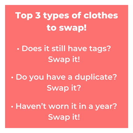 If you have clothing (or accessories for that matter) in your closet that still have tags on them…swap them. If you haven’t taken the tags off yet - it’s likely that you won’t and will never wear it or use it. It’s not embarrassing to bring in items with tags…we all have things we buy that we just never wore. For me, it’s usually because I didn’t try it on in the store and then I bring it home, try it on, decide I don’t like it and never return it. Wasteful…yes! I will not be buying clothes without trying them on before leaving the store again…pinky swear.